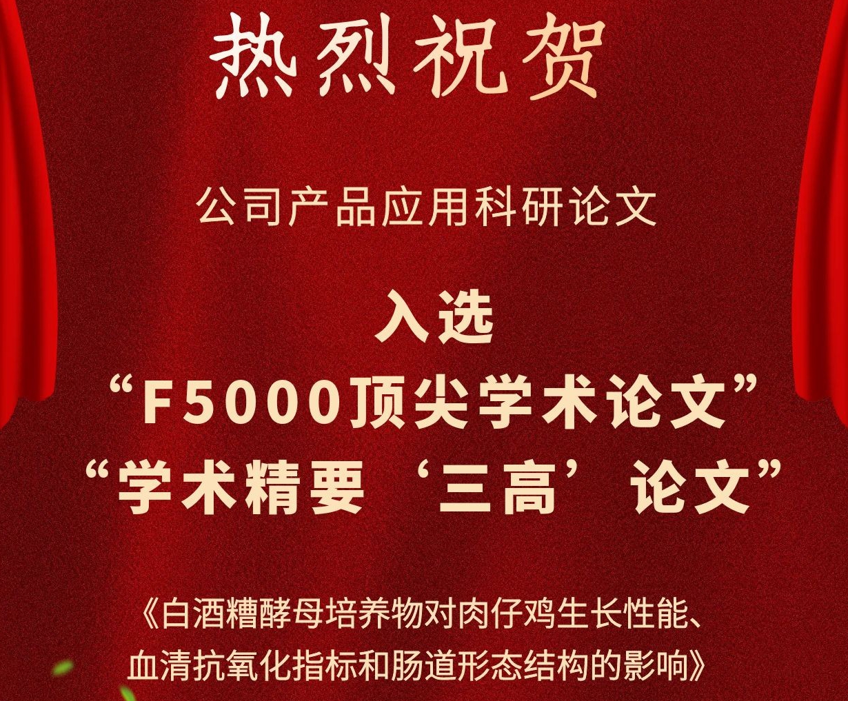 近日,公司產(chǎn)品應用科研領域又聞佳訊傳來! 公司與中國農業(yè)科學院飼料研究所家禽營養(yǎng)與飼料創(chuàng)新團隊共同完成并發(fā)表于《動物營養(yǎng)學報》(2019,31(5): 2357-2366)的學術論文—《白酒糟酵母培養(yǎng)物對肉仔雞生長性能、血清抗氧化指標和腸道形態(tài)結構的影響》,入選2022年度“領跑者5000—中國精品科技期刊頂尖學術論文(F5000)”和學術精要(2023年5-6月)高PCSI論文、高被引論文和高下載論文。 該論文探究了公司白酒糟酵母培養(yǎng)物對肉仔雞生長性能、血清抗氧化指標和腸道形態(tài)結構的影響。研究表明,飼糧添加白酒糟酵母
