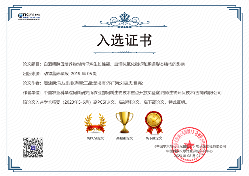 公司與中國(guó)農(nóng)業(yè)科學(xué)院飼料研究所家禽營(yíng)養(yǎng)與飼料創(chuàng)新團(tuán)隊(duì)共同完成并發(fā)表于《動(dòng)物營(yíng)養(yǎng)學(xué)報(bào)》(2019,31(5): 2357-2366)的學(xué)術(shù)論文—《白酒糟酵母培養(yǎng)物對(duì)肉仔雞生長(zhǎng)性能、血清抗氧化指標(biāo)和腸道形態(tài)結(jié)構(gòu)的影響》,入選2022年度“領(lǐng)跑者5000—中國(guó)精品科技期刊頂尖學(xué)術(shù)論文(F5000)”和學(xué)術(shù)精要(2023年5-6月)高PCSI論文、高被引論文和高下載論文。